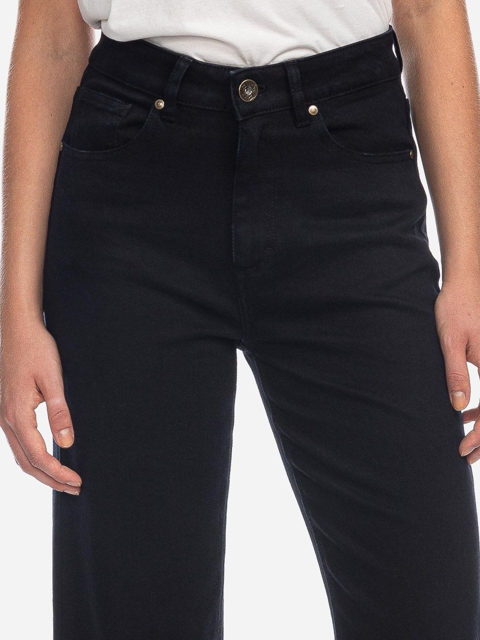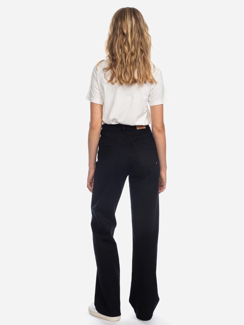 Modieuze recht vallende retro damesjeans met hoge taille. De broek is gemaakt van donker zwarte denim. De broek heeft comfortabele snit, een relaxte pasvorm en de stof heeft 2% bio elastane stretch.
