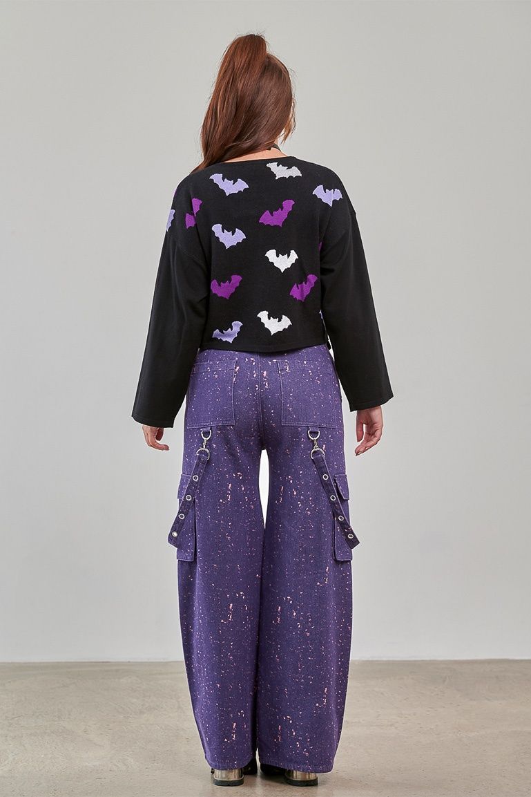 Banned | Funky retro broek, Candy paarse met verf-spatjes, straps en zakken