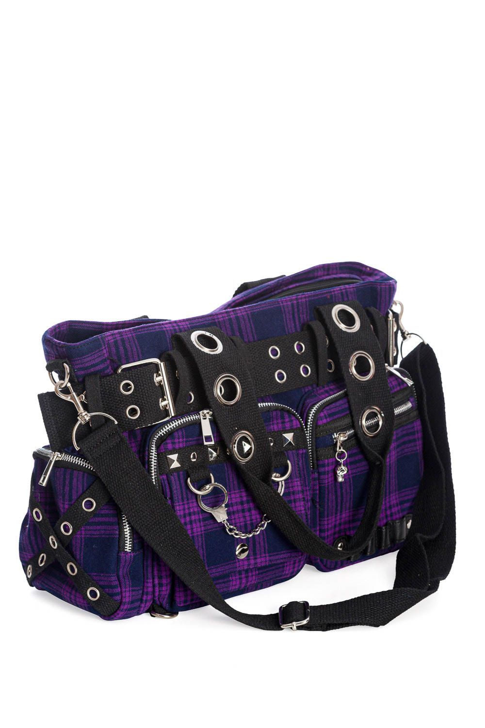 Deze stevige Gothic tas is van paarse tartan en heeft grote ronden ringen in de hengsels. Veel handige extra vakjes met rits-details, studs en een kettinkje.
