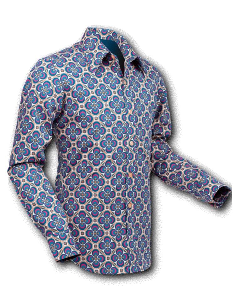 Chenaski seventies overhemd met kleurrijke jaren zeventig retro dotsgrid print. De vorm van de verstevigde kraag en de taillering van het model geven de perfecte pasvorm met een jaren 70 uitstraling. Het overhemd heeft een borstzakje.