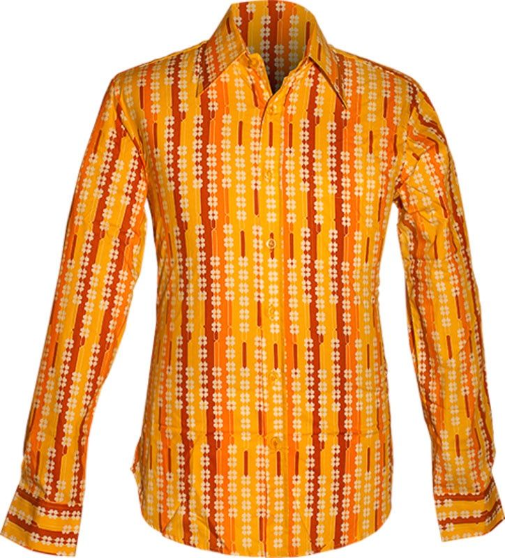 Chenaski seventies overhemd met gele jaren zeventig retro klaver print. De vorm van de verstevigde kraag en de taillering van het model geven de perfecte pasvorm met een jaren 70 uitstraling. Het overhemd heeft een borstzakje.