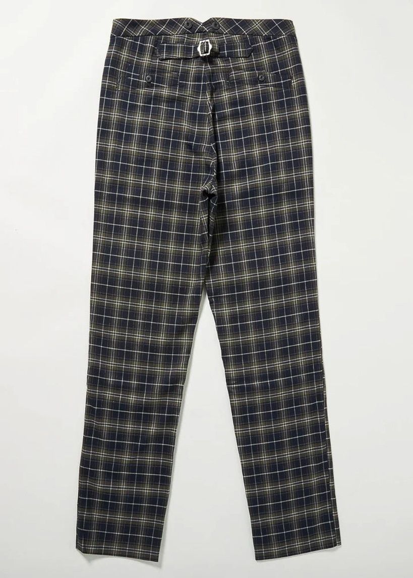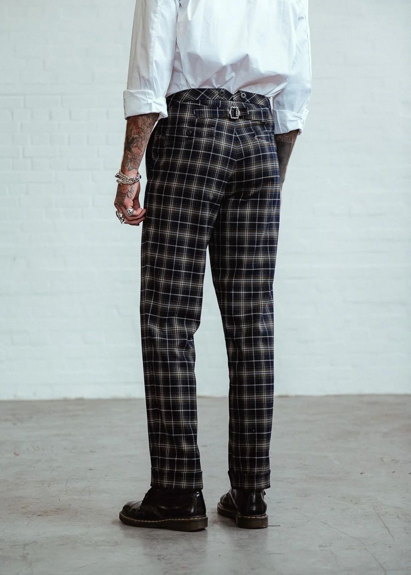De jaren 40 pantalon heeft een klassieke ruit. De broek is voorzien van twee steekzakken voor en paspelzakken achter. En een bandje met gespje achter, om de taille te verstellen. Combineer met een T-shirt voor een relaxte look.