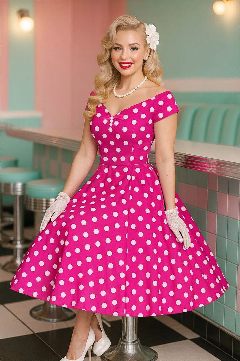 Deze vintage-geïnspireerde off-the-shoulder jurk heeft een flatterende off-the-shoulder halslijn en een aansluitend lijfje dat in de taille geaccentueerd wordt. De rok loopt wijd uit in een klassiek swingmodel en valt tot halverwege de kuit. De jurk is gemaakt van ons nieuwe, hoogwaardige en zachte katoen met stretch voor een comfortabele pasvorm en wordt geleverd met een smalle riem, een YKK-ritssluiting aan de achterkant en verborgen zijzakken – altijd een favoriet van onze klanten. De jurk is hot-pink en de witte stippen zijn 2 cm.