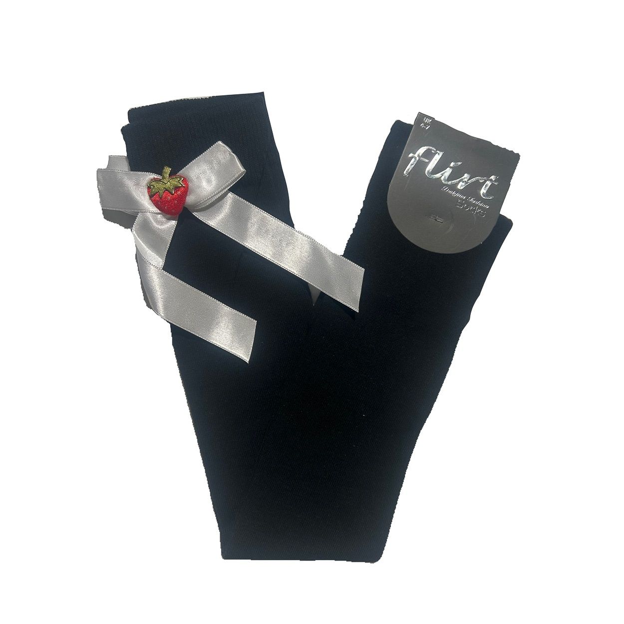 Flirt | Overknee sokken zwart met witte strik en aardbei, lolita-stijl