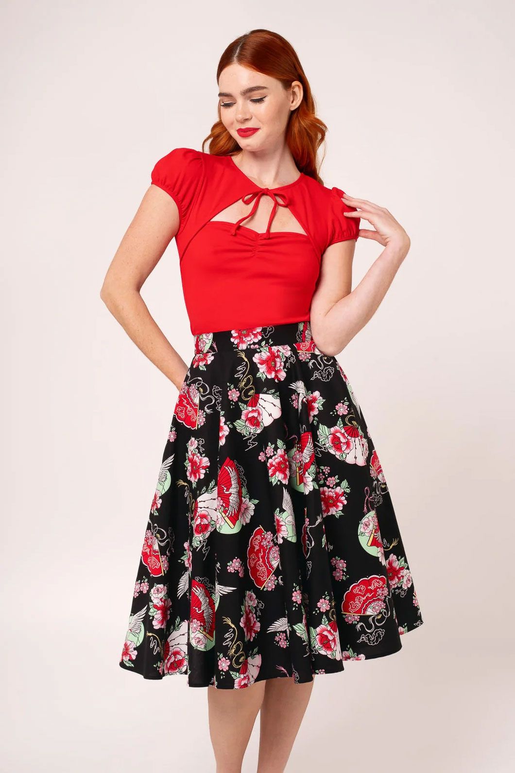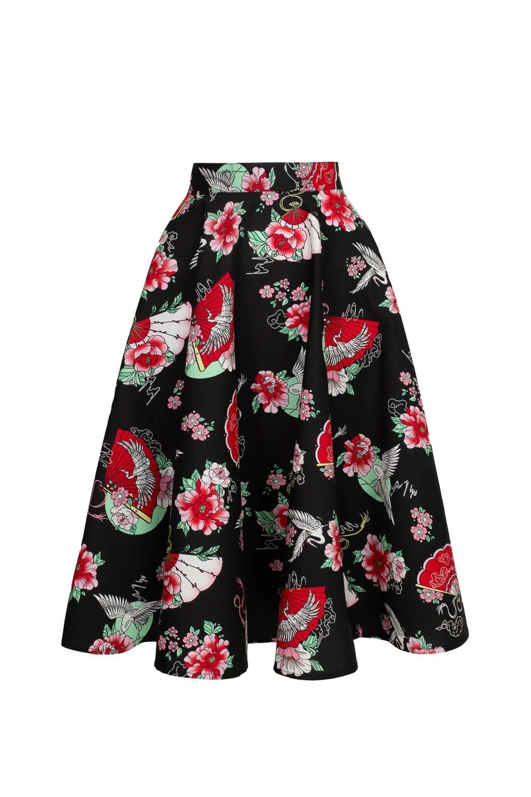 Ontdek de tijdloze elegantie van de Yuna-rok. Deze prachtige zwarte katoenen rok, geïnspireerd op de stijlvolle jaren 50, straalt een klassieke charme uit met een moderne twist. Versierd met verfijnde motieven van rode en roze waaiers, vliegende kraanvogels en bloemen, brengt deze wijde cirkelrok een speelse en elegante uitstraling.