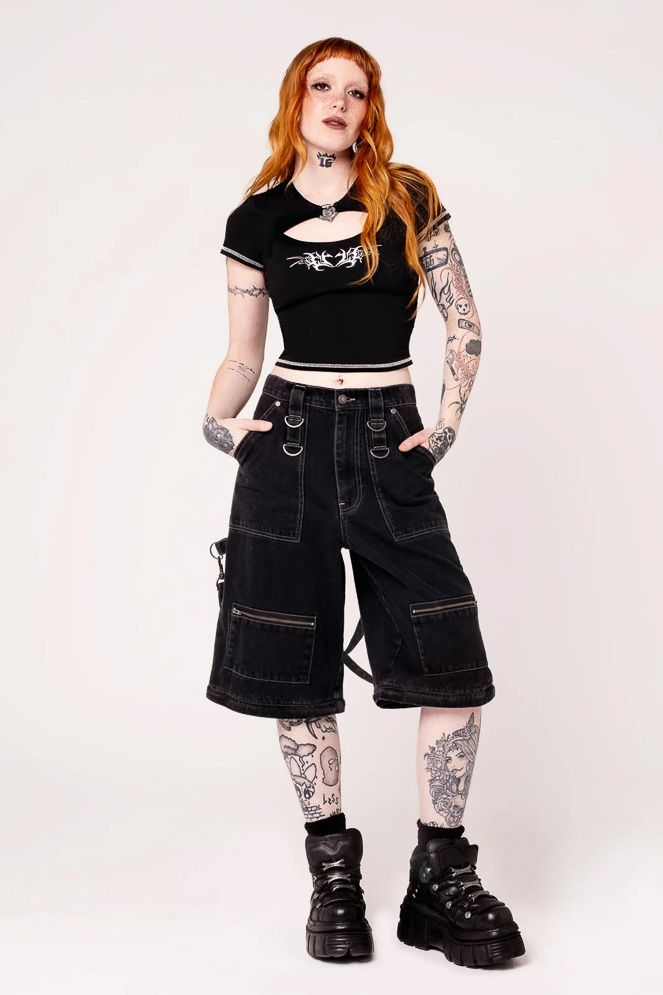 Hell Bunny | Zwarte washed skater jeans Sid X, met D-ringen en ruime zakken