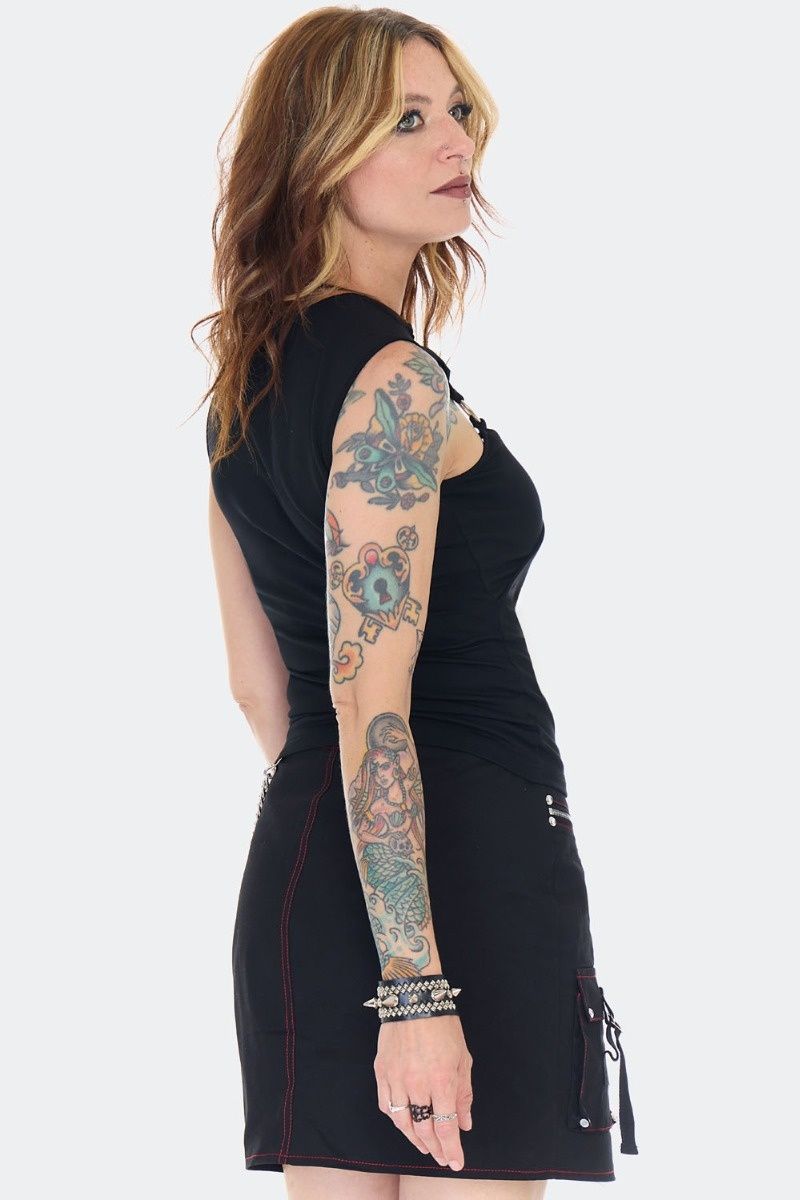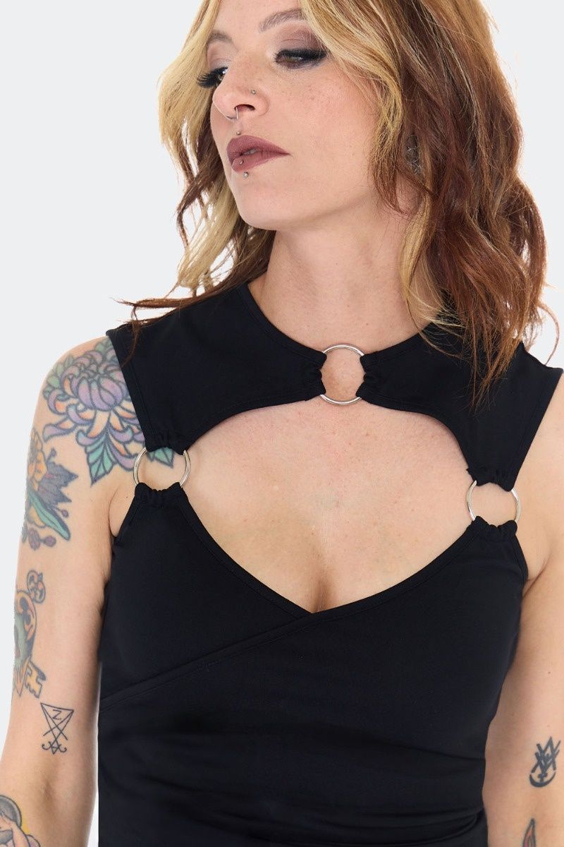 Mouwloze zwarte top van elastische jersey met zilverkleurige metalen O-ringdetails en een uitgesneden borststuk.