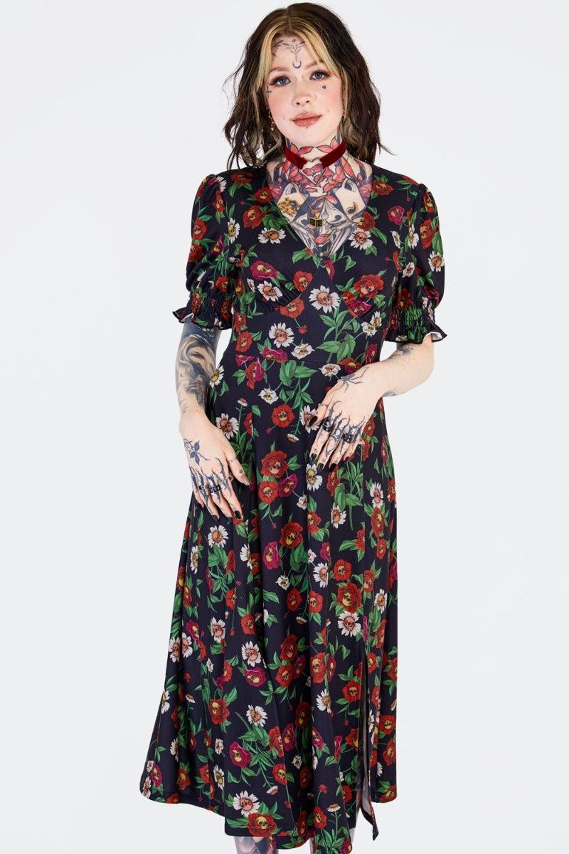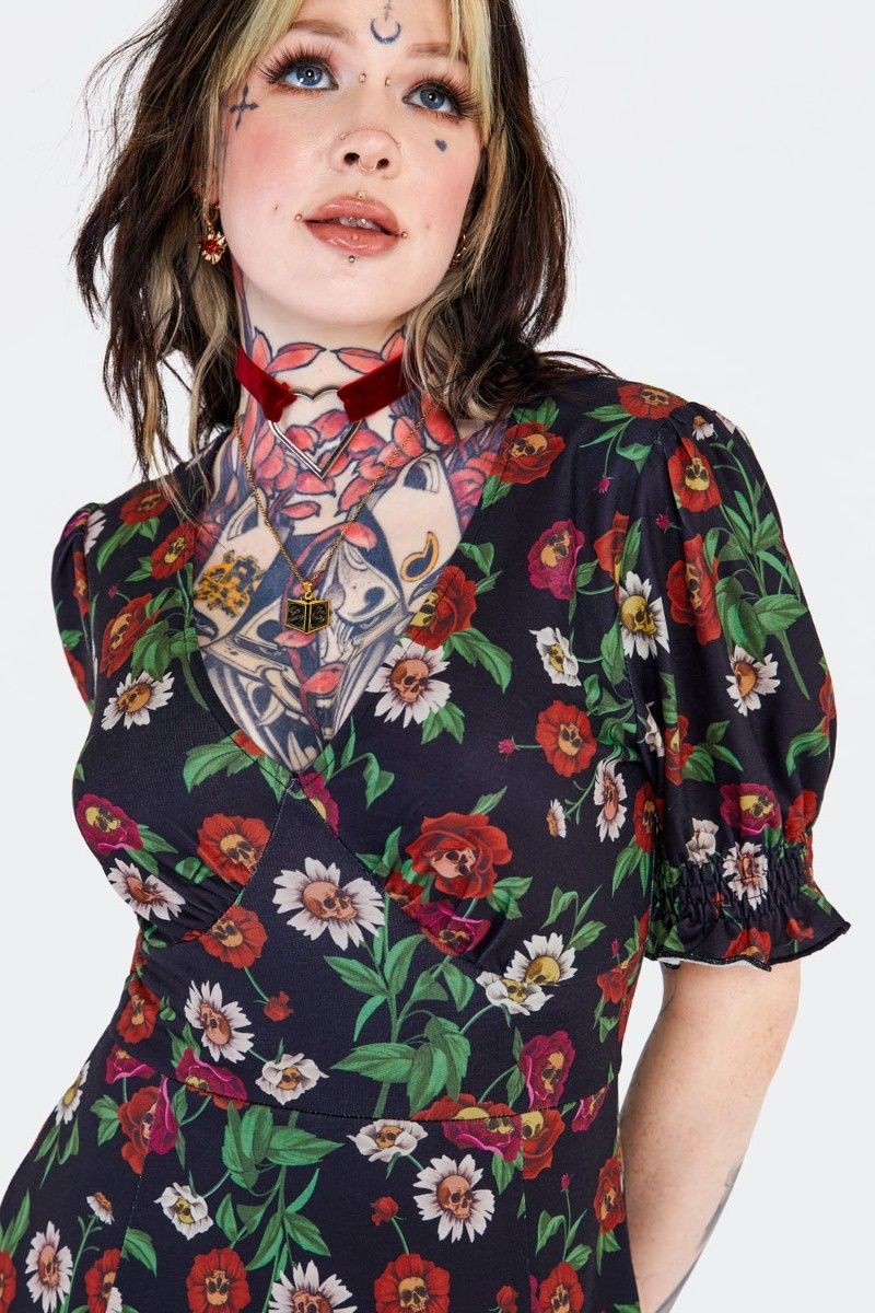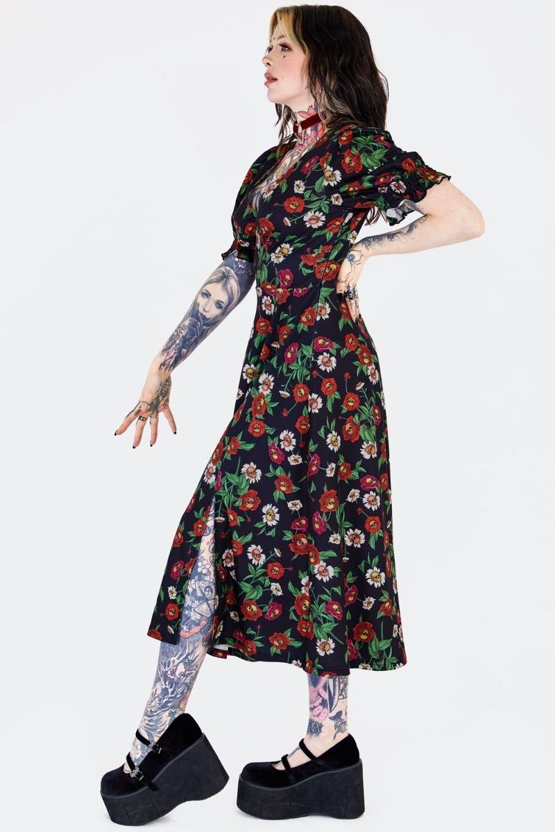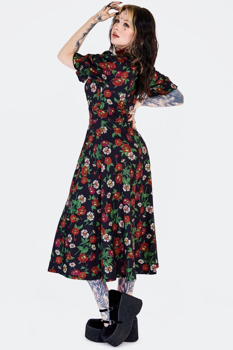 Jawbreaker | Jaren 80 Skull Flower midi jurk met pofmouwen