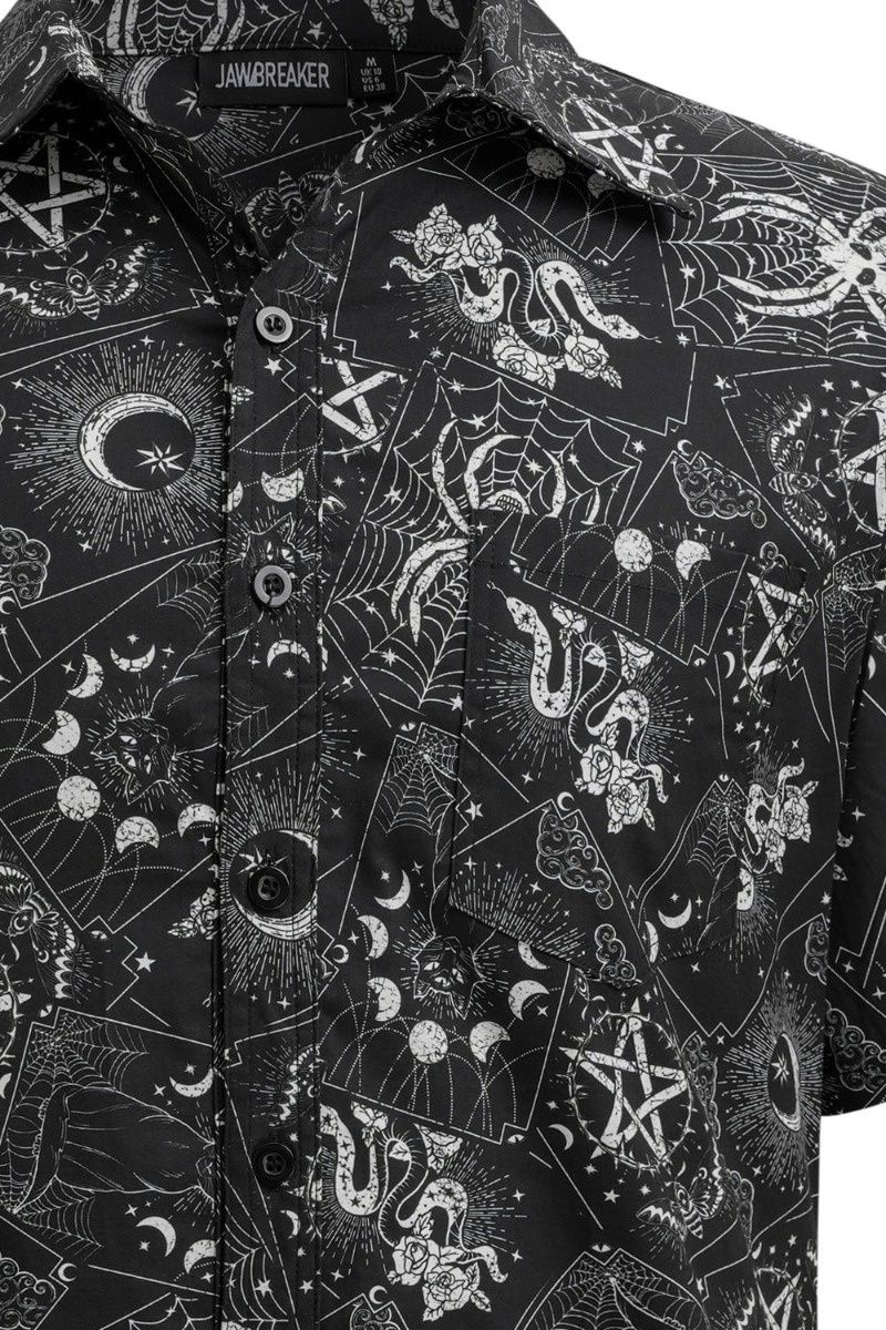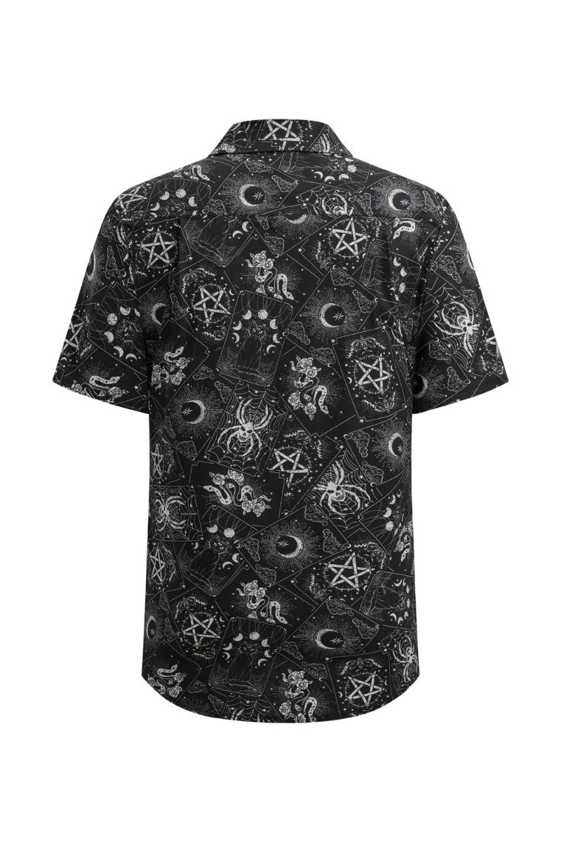 Gotisch, op tarot geïnspireerd overhemd met korte mouwen zwarte ondergrond met een witte all-over print in zwart. Met een klassieke kraag, voorzak, knoopsluiting aan de voorkant en gemaakt van een licht elastische stof voor een perfecte, slanke pasvorm.
