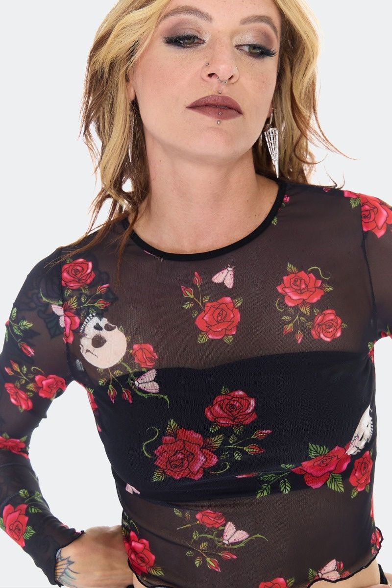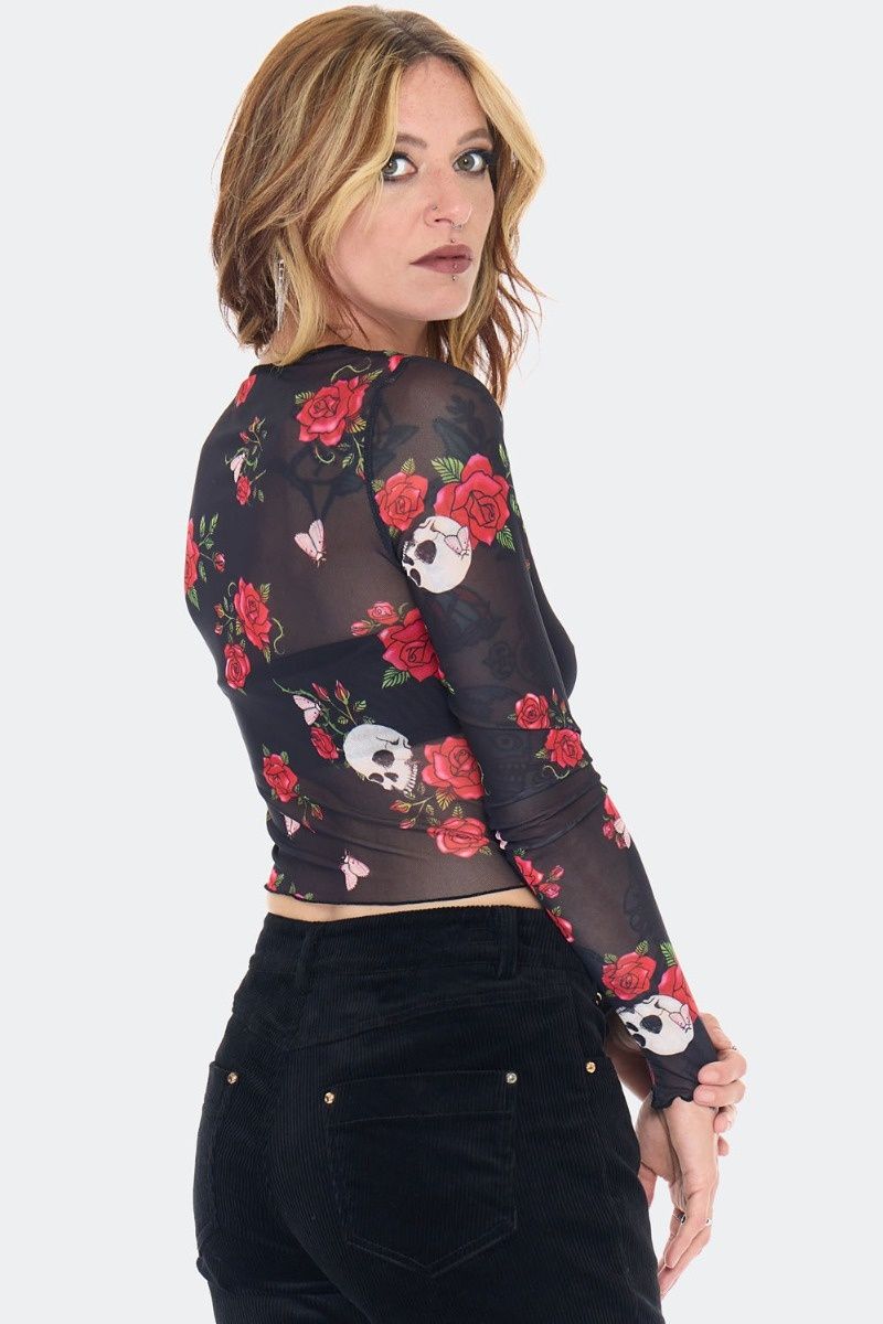 Jawbreaker | Zwarte skull & rose print mesh top met lange mouwen