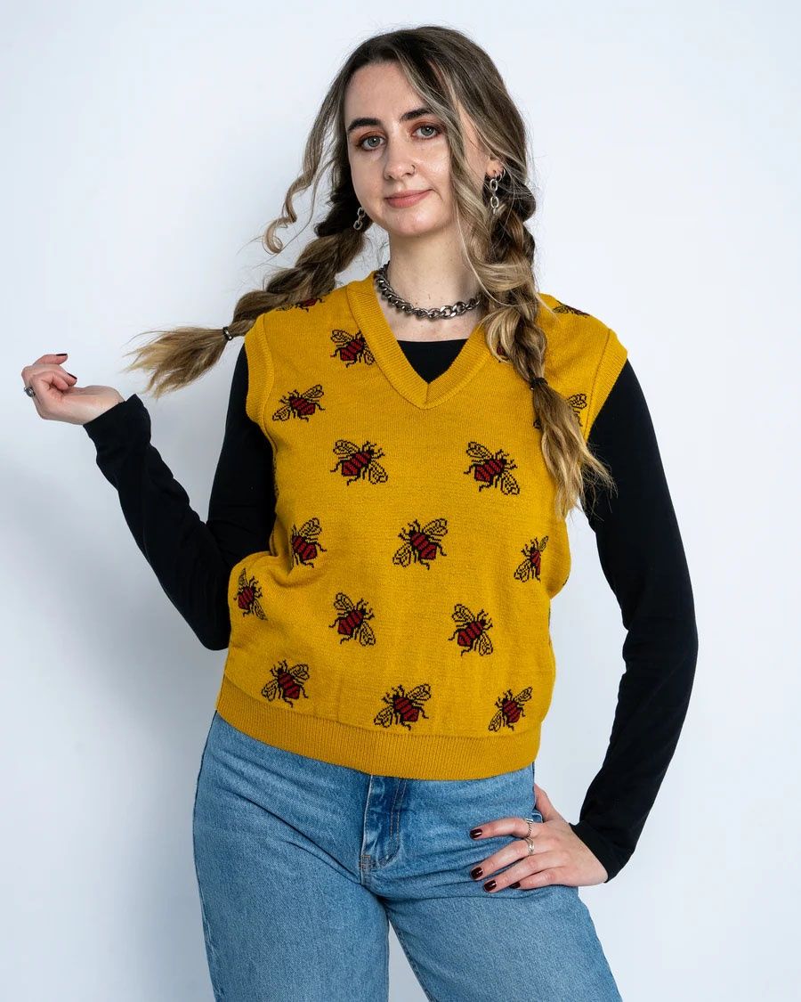 Geef je garderobe een vrolijke touch met de Run & Fly Bee goudgele spencer met V-hals. Deze knusse gebreide top heeft een all-over bijenmotief op een rijke mosterdgele basis, wat zorgt voor een charmante cottagecore-look met een speels sfeertje. Perfect om te dragen over tops met lange mouwen of jurken, of gewoon zo als het weer het toelaat.