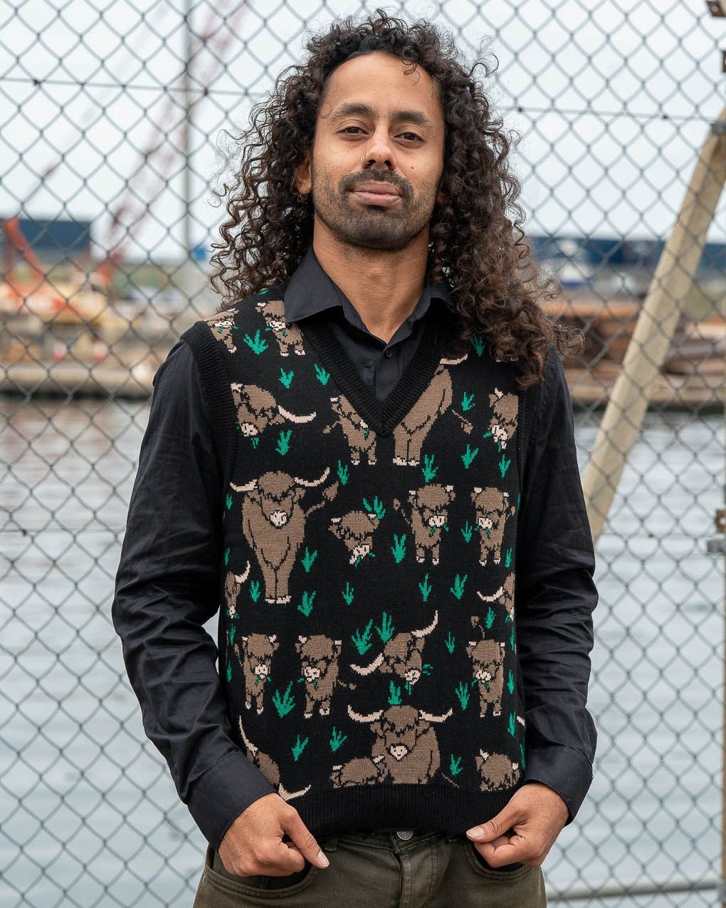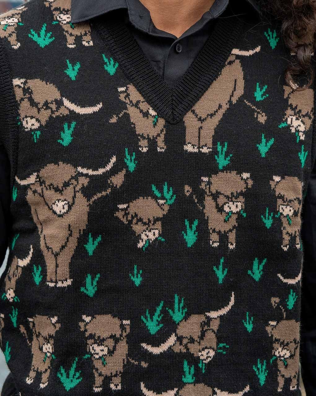 Deze Spencer is gemaakt in Engeland met liefde (en een vleugje magie)! Dit knusse gebreide top zonder mouwen is voorzien van een geweldige Schotse hooglandkoeienpatroon, ontworpen door Jen James Design. Perfect om als 2e laag te dragen in alle seizoenen. Je kunt het combineren met een overhemd, T-shirt of coltrui voor een retro-meets-country-coole look.
