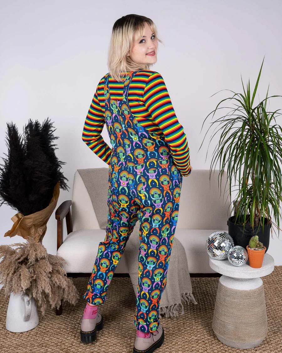 Maak vrolijke dansjes met de Run & Fly Rainbow Frogs Stretch Twill Tuinbroek! Deze marineblauwe tuinbroek met vrolijke cartoon-kikkers en levendige regenbooghalo's is een uitbarsting van vreugde. Eerlijk handgemaakt van comfortabele stretch twill, perfect om je dag mee te beginnen, of je nu lekker lounget, danst of gewoon opvalt. Met meerdere snackvakken en verstelbare bandjes is hij even praktisch als speels.