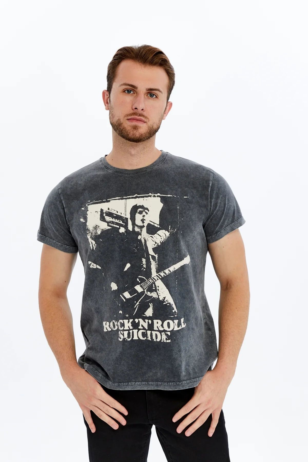 Grijze stonewash T-shirt met een witte rock 'n Roll print met de tekst Rock 'n Roll Suicide