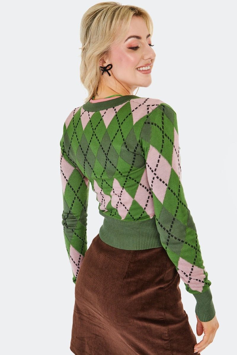 Voodoo Vixen | Groene roze gebreide cardigan met V-hals en Argyle ruit patroon