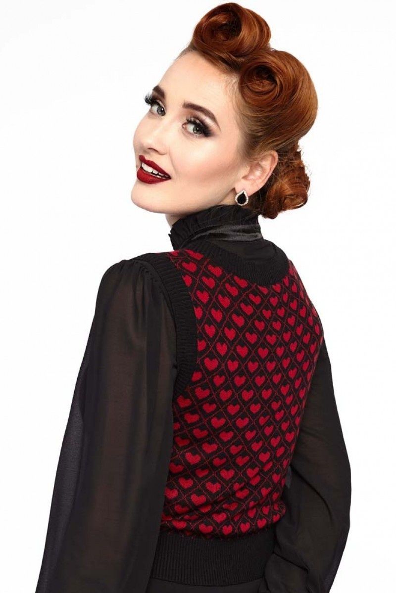 Gebreide Rock 'n Roll spencer, mouwloos met V-hals en brede zwarte boorden met een contrasterend rood ingebreid hartjes patroon op de voor en achterkant.