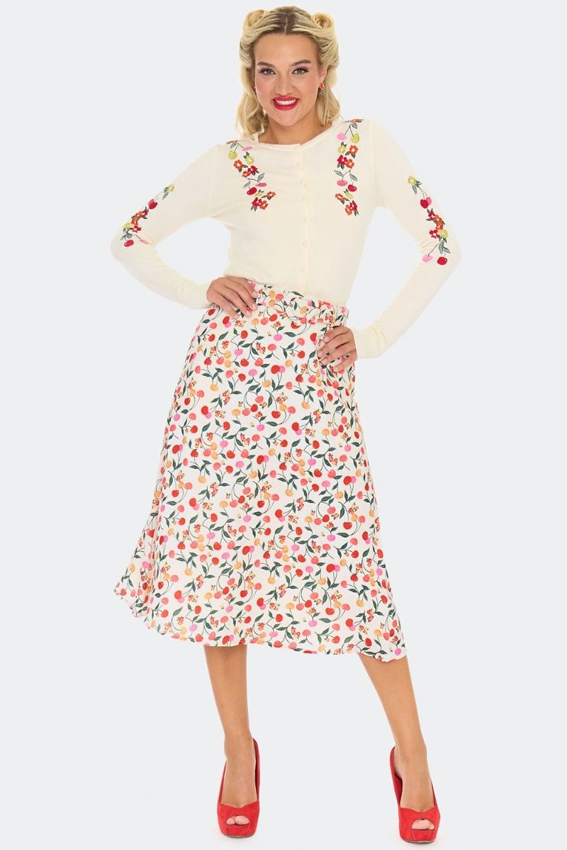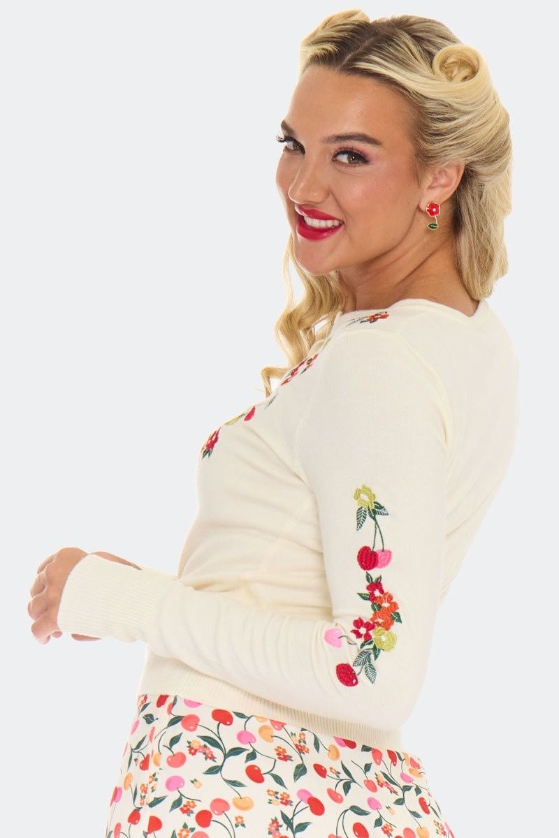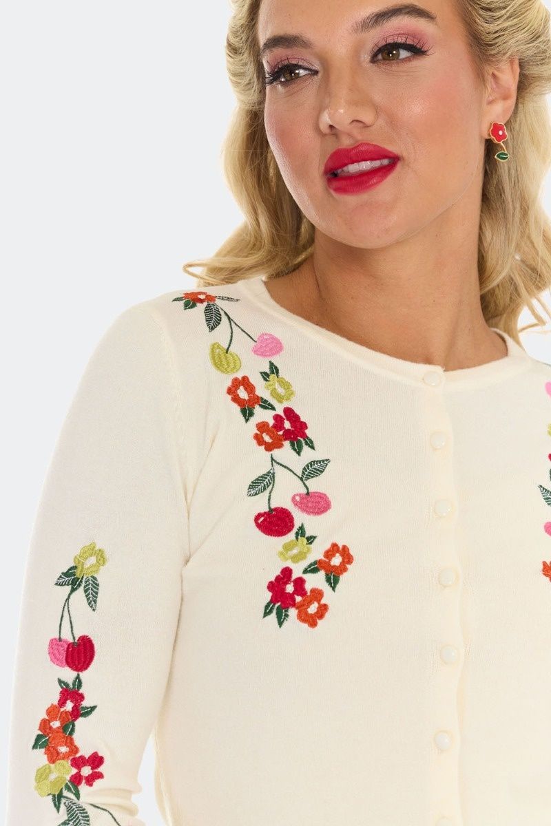 Vintage geïnspireerd vest met ronde hals en een kleurrijk kersenborduurwerk op de voorkant en de mouwen. Met knoopsluiting aan de voorkant, lange mouwen en gemaakt van een zachte, lichtgewicht crèmekleurige gebreide stof.