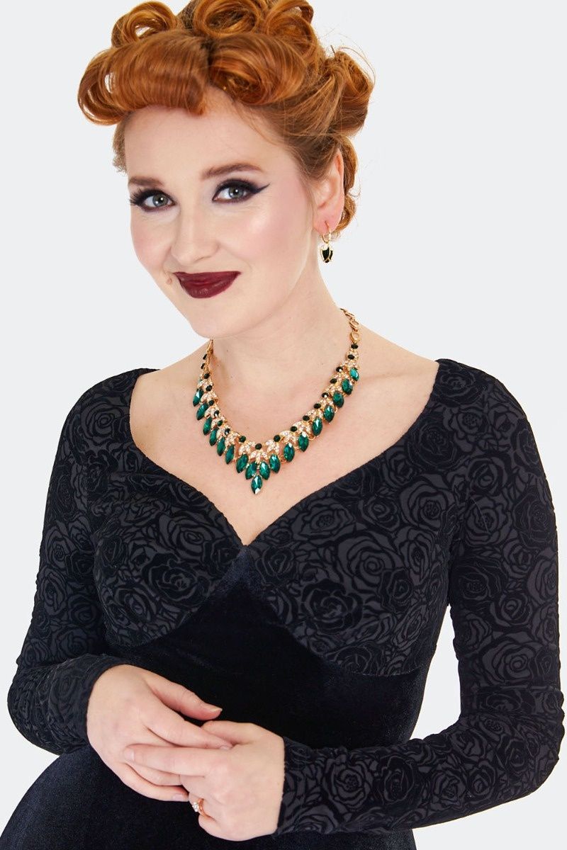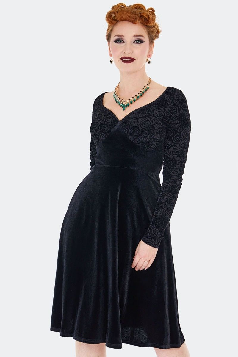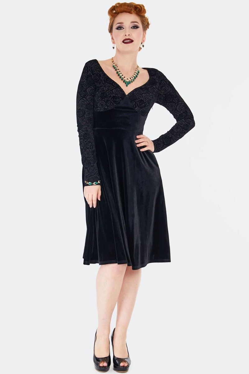 Voodoo Vixen | Zwarte jaren '50 fluwelen avondjurk met lange mouwen