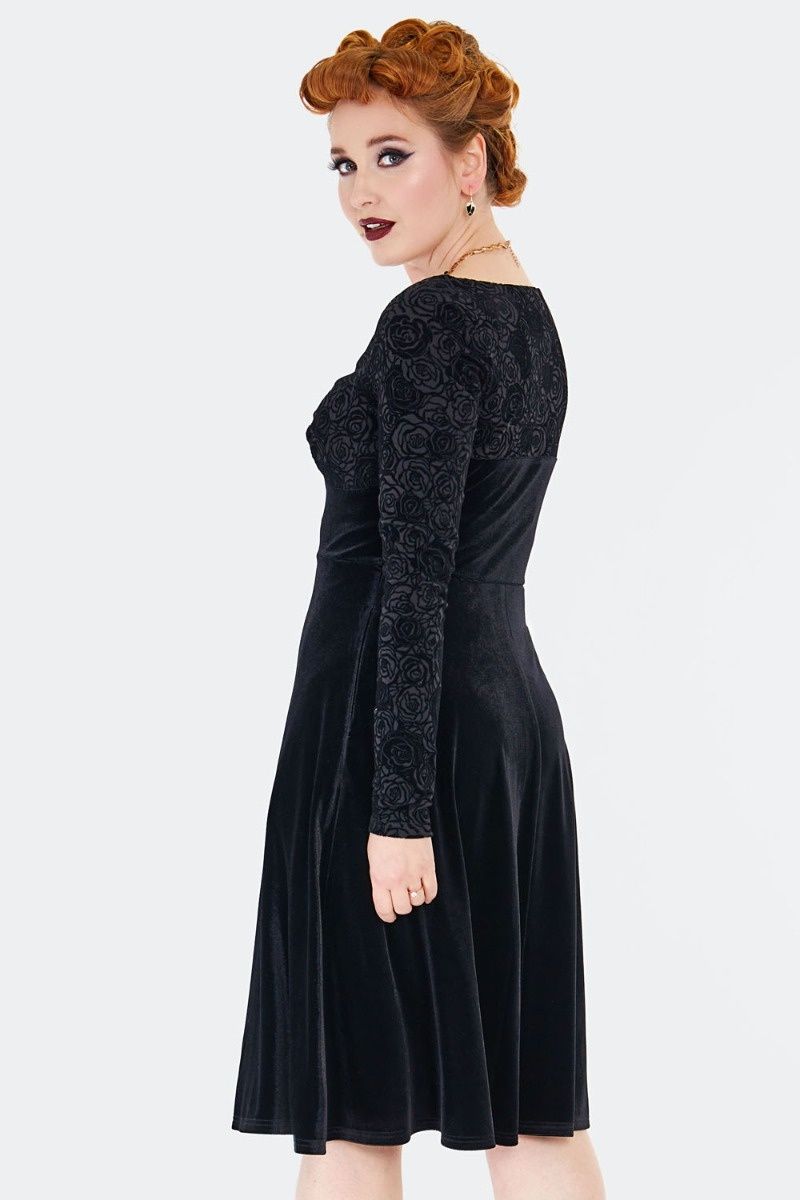Zwarte fluwelen avondjurk in vintage stijl met een rozenpatroon op de mouwen en als borst en schouderdetail, zakken aan de zijkanten en een ritssluiting.